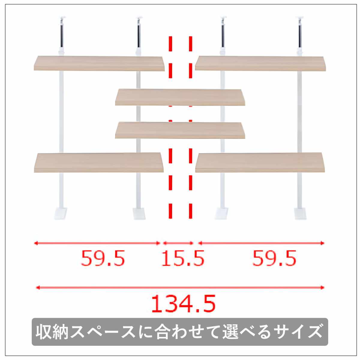 幅59.5cmの棚板を間に連結する場合は点線の間のサイズは15.5cm、幅89.5cmの棚板を間に連結する場合は点線の間のサイズは45.5cm、幅119.5cmの棚板を間に連結する場合は点線の間のサイズは75.5cmになります。