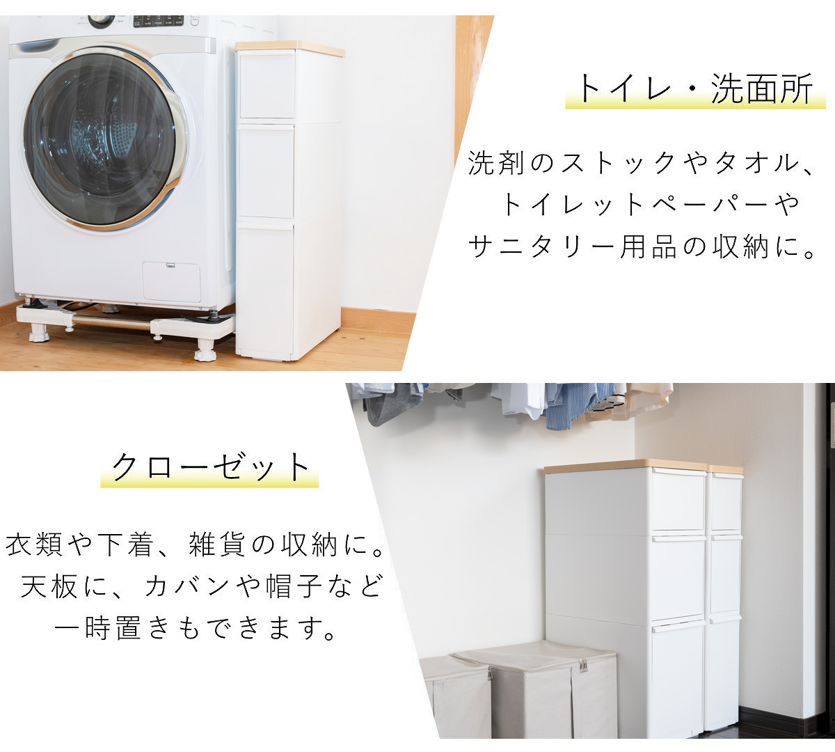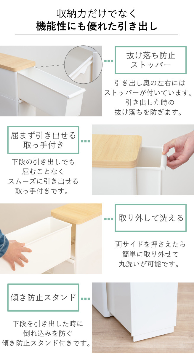 | 材質 | 本体・引出し:ポリプロピレン 木製天板:表面/化粧合板(メラミン加工)、芯材/繊維材(MDF) |