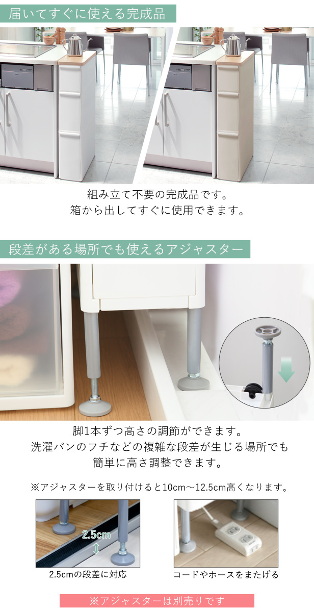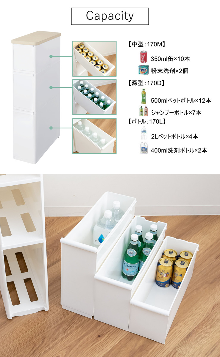 | 引き出し1段あたり耐荷重 | 中型・深型:約 5kg ボトル:約 10kg |