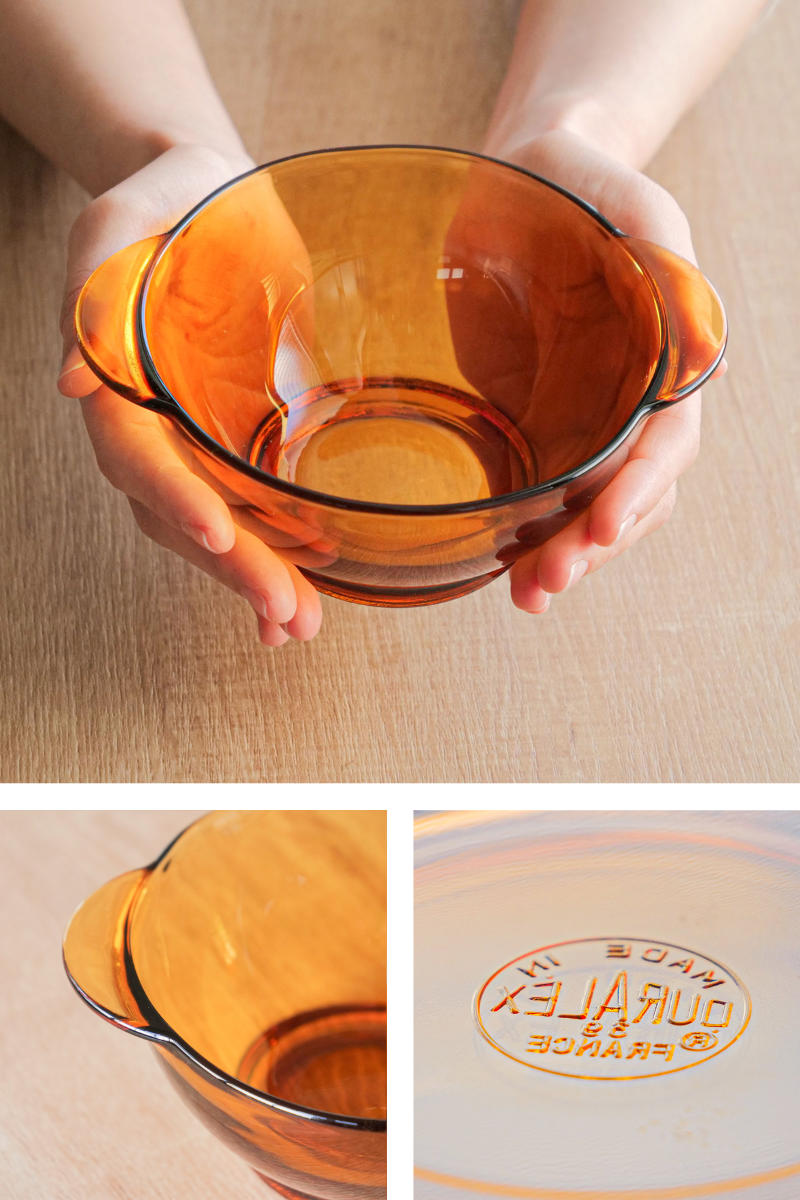 表面はつるつると滑らかな質感です。熱いお料理を入れた時に便利な持ち手付きです。程よい厚みと重さで安定感があり、手に沿うフォルムでしっくりと馴染みます。底面には「DURALEX」の刻印入りです。