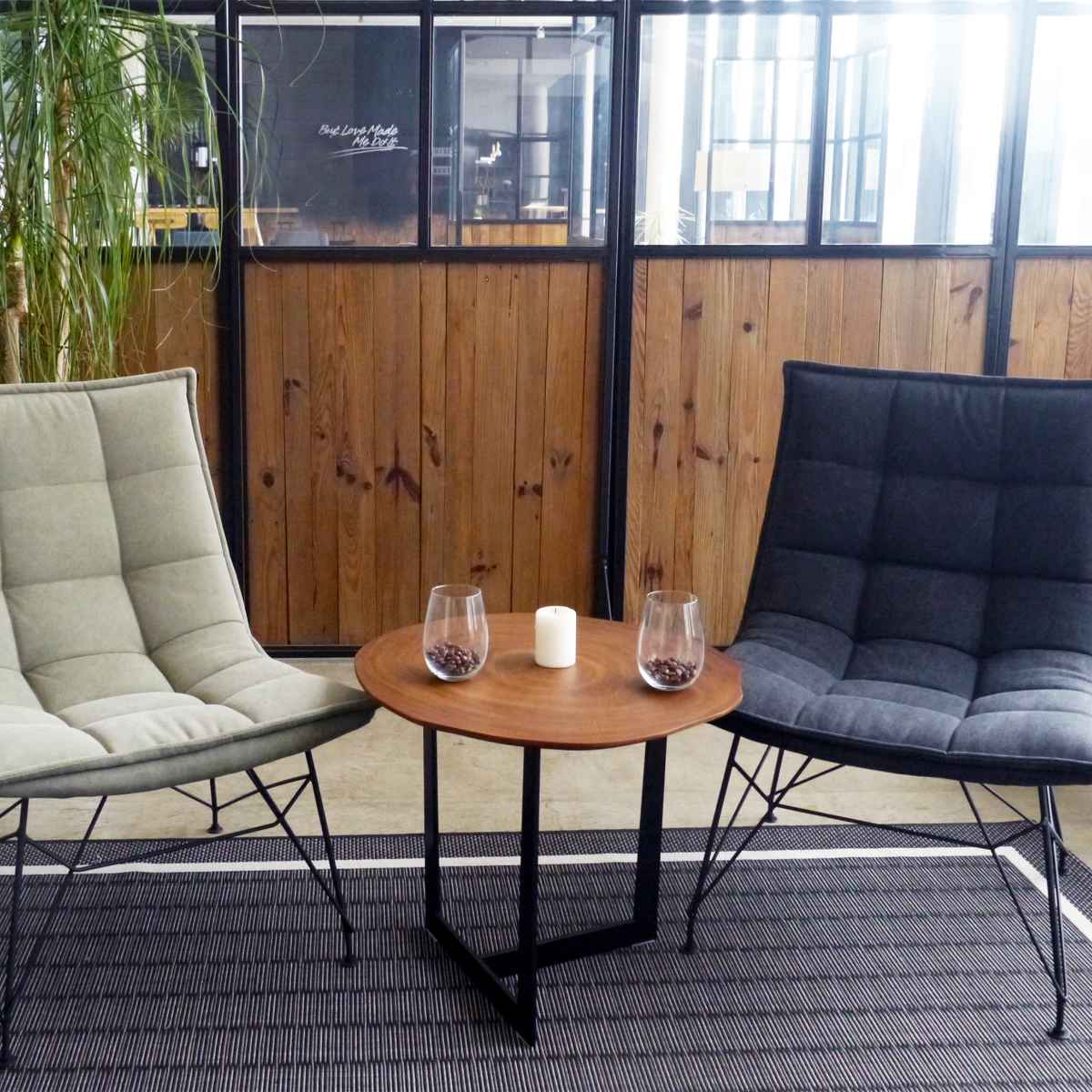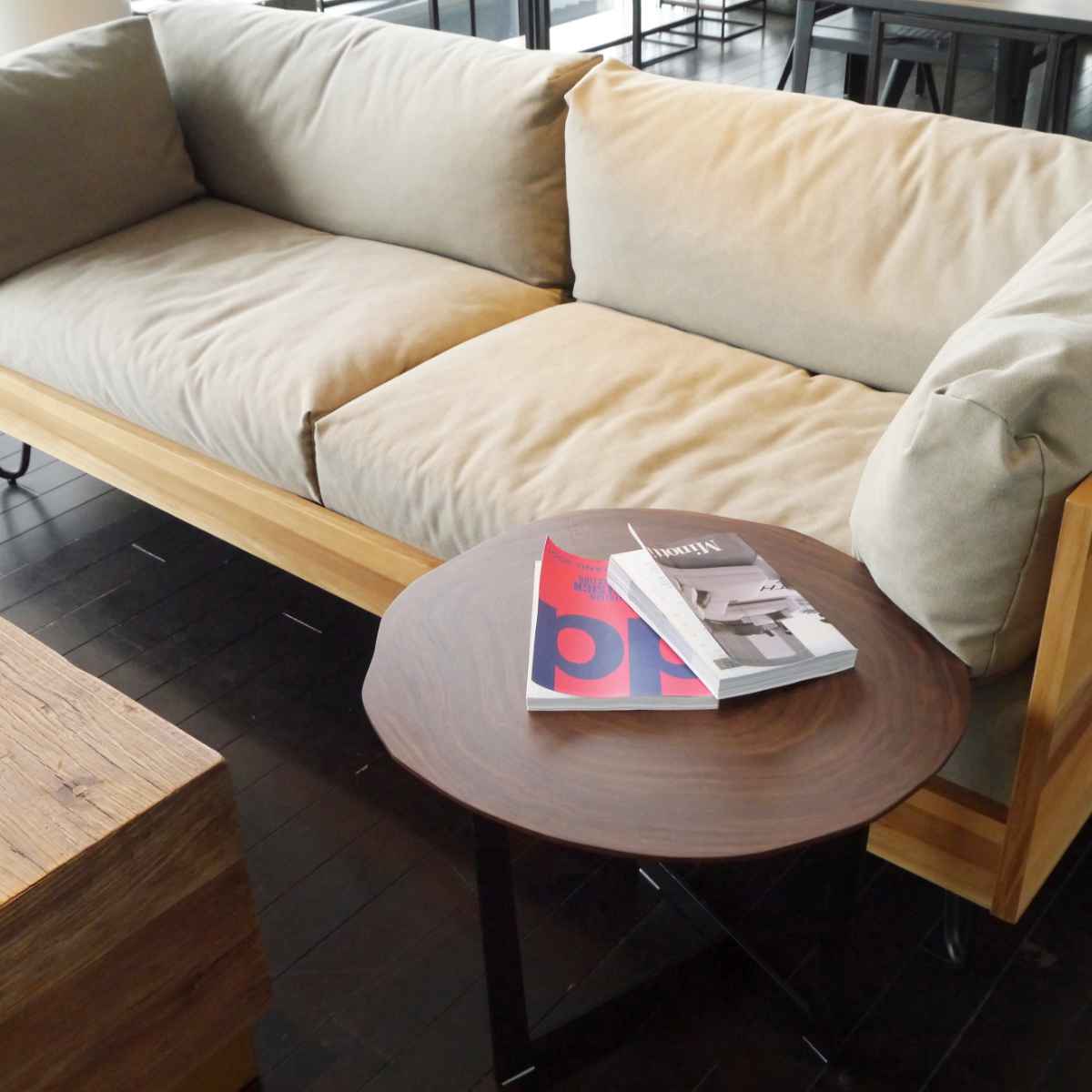 ウォールナットの丸太をスライスした重厚感のあるサイドテーブル