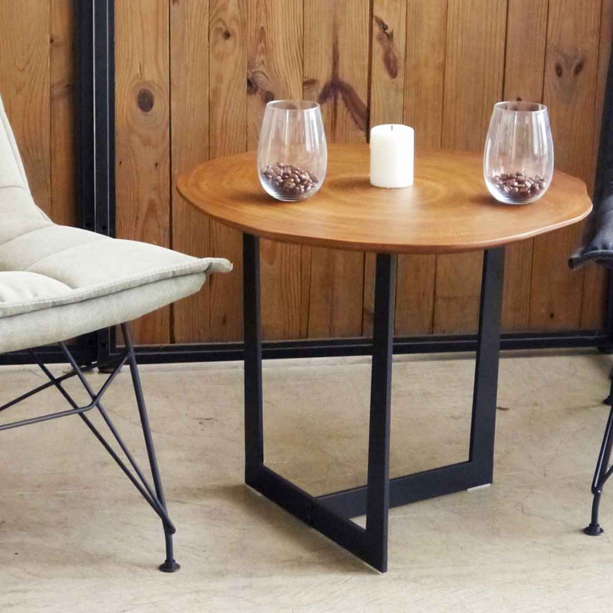 有機的な天板の形状は、天然素材ならではの木の温かみが感じられます。インダストリアル・カフェテイストにもおすすめです。