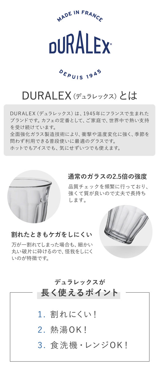 | 注意事項 | DURALEX製品は、製造上、気泡やすり傷、しわ模様、飲み口の凹凸、底面の線、軽いぐらつきなどが見られる場合があります。 これらは製品の特性で、ご使用には問題ありません。 そのため、不良品ではなく返品・交換の対象外となります。 あらかじめご了承のうえ、ご購入をお願いいたします。 |