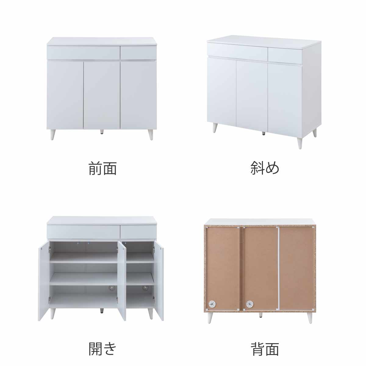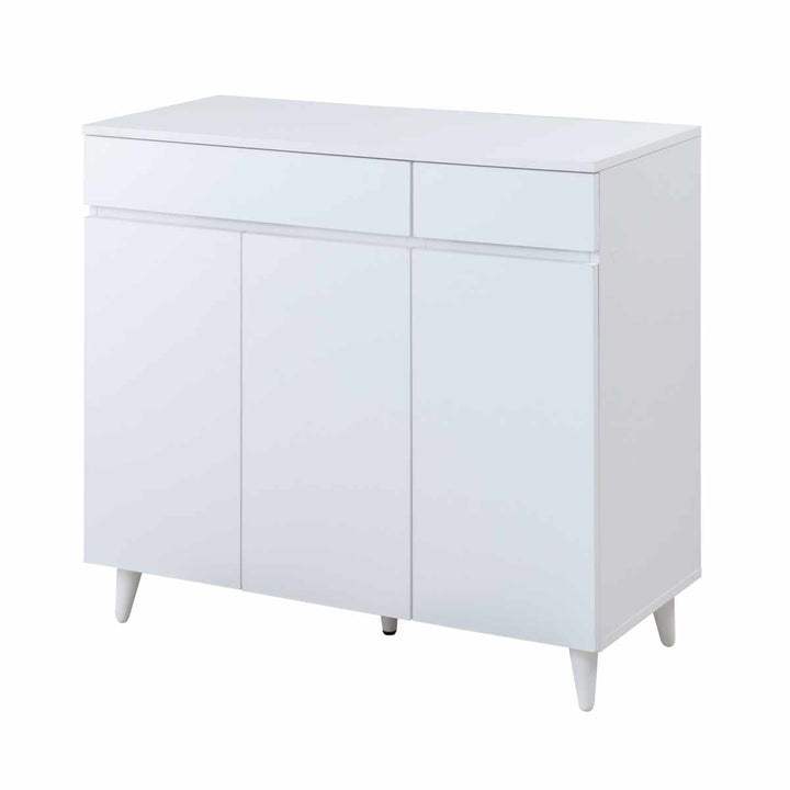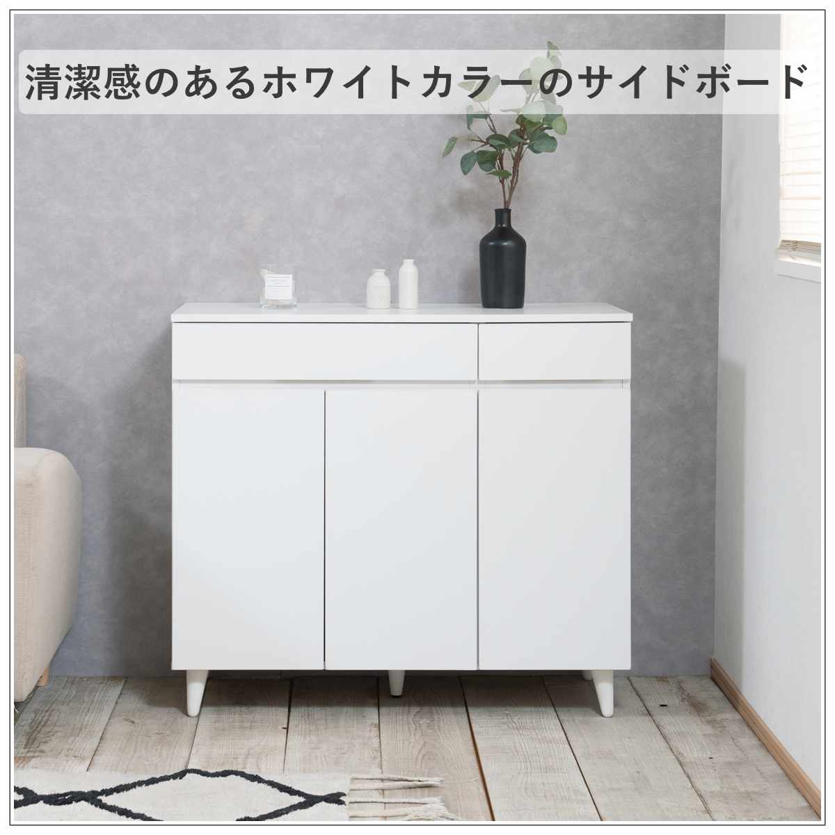 明るく清潔感のあるホワイトカラーのサイドボードです。スッキリとしたデザインに、天然木を使用したスタイリッシュな脚部がアクセントとなっています。