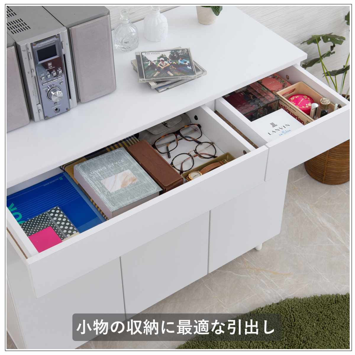 上段の引出しは、キッチン周りの布巾やカトラリー、リビング周りの小物の収納に便利です。取っ手のないデザインで、スマートな仕上がりです。
