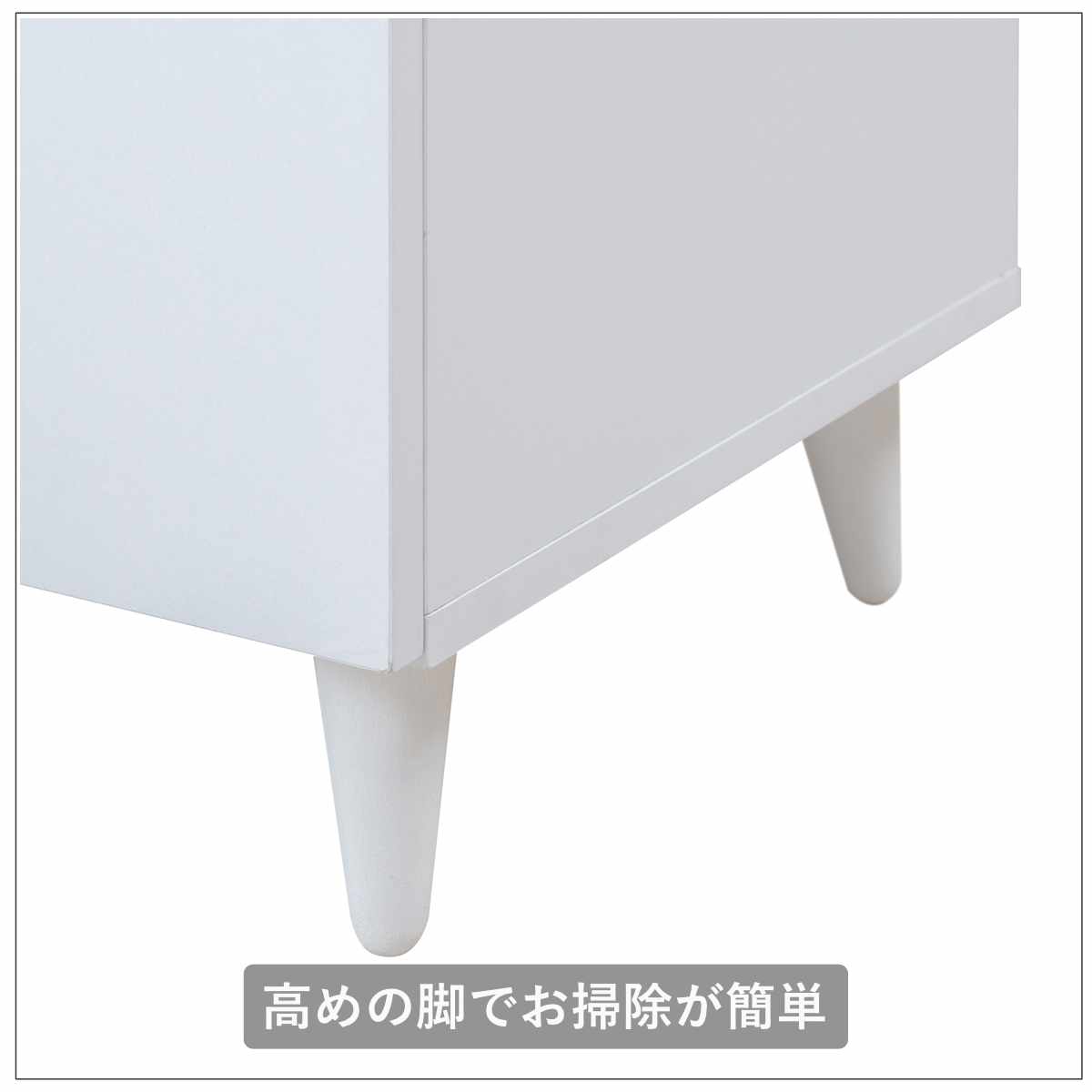 天然木の脚部はつやを落とした水性塗装で仕上げています。約10cmと高めの脚部なので、お掃除も楽に行えます。掃除機やモップ等がかけやすく、お掃除ロボットが通ることができるのも嬉しいポイントです。