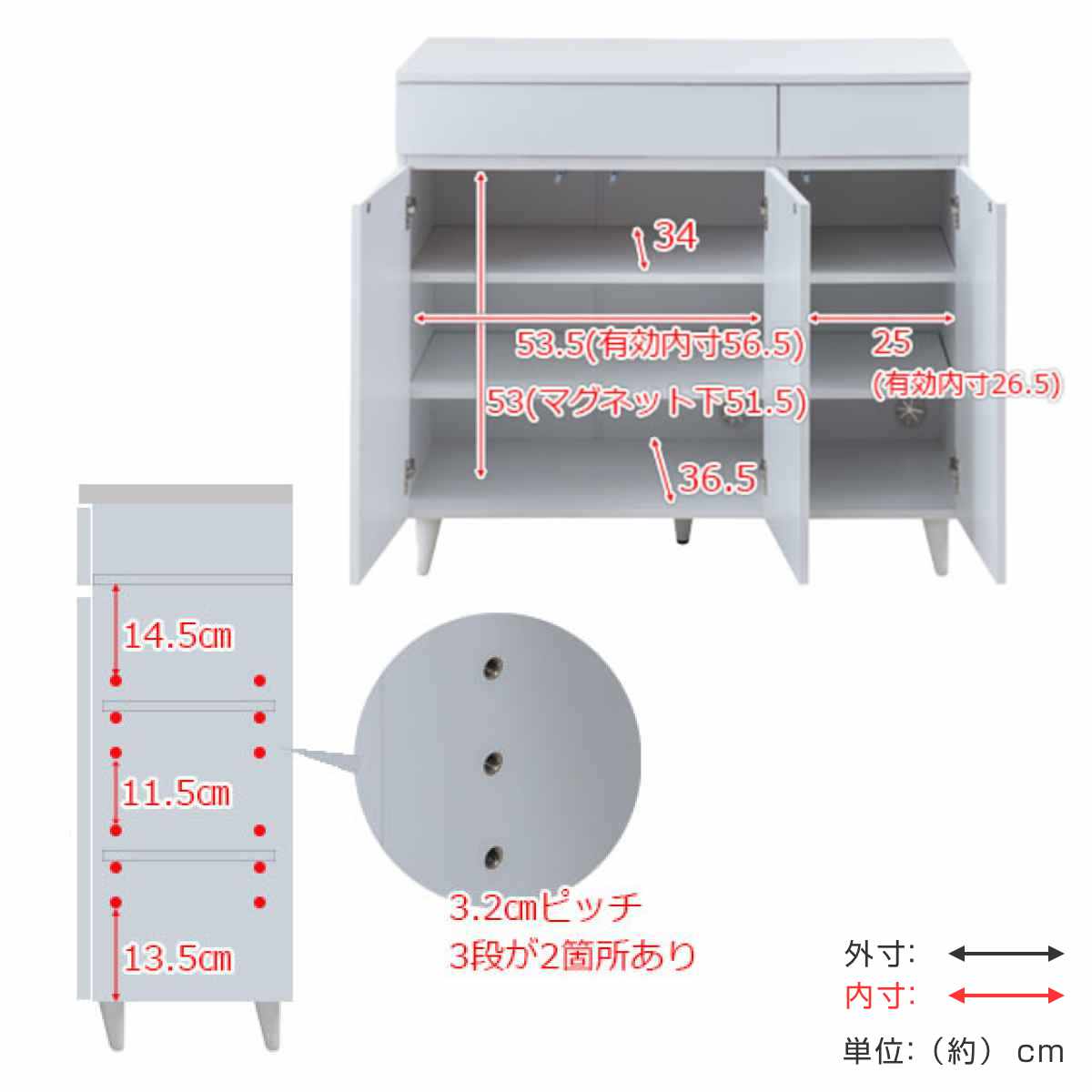 【可動棚大小2枚ずつ:3.2cmピッチ3段階】