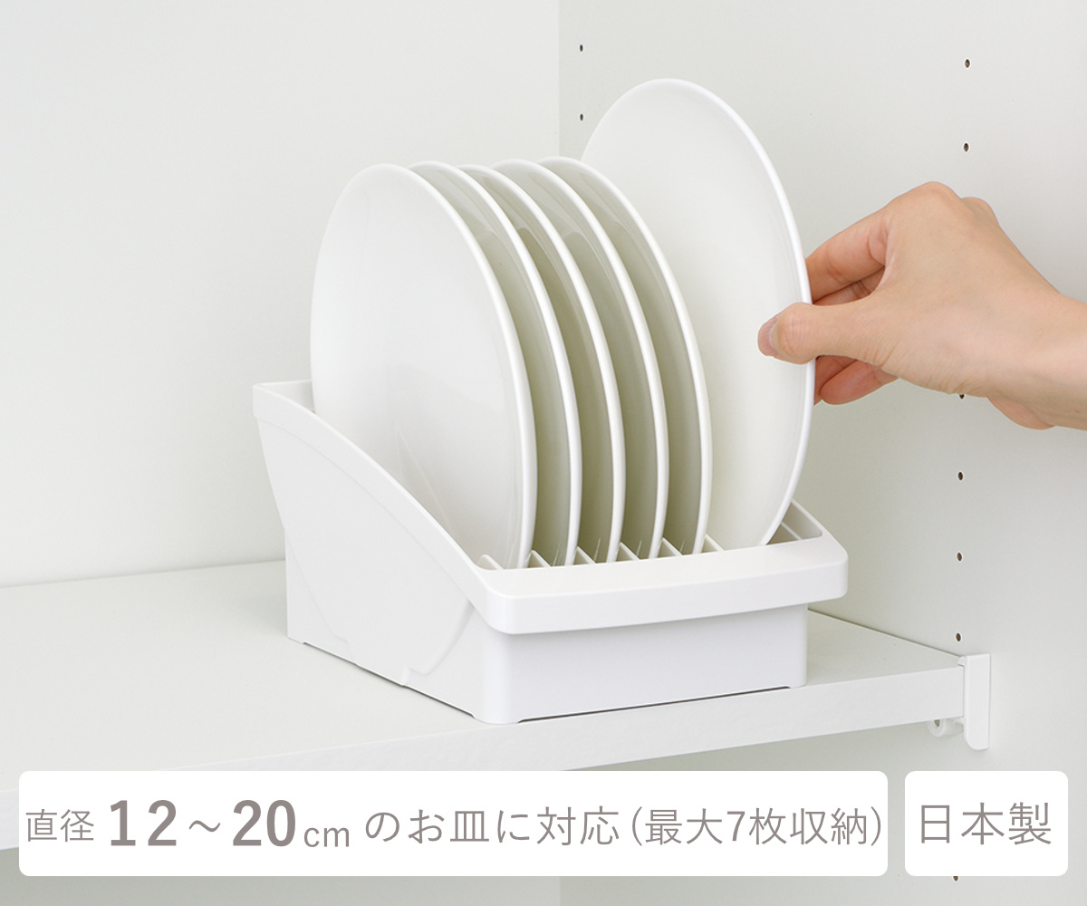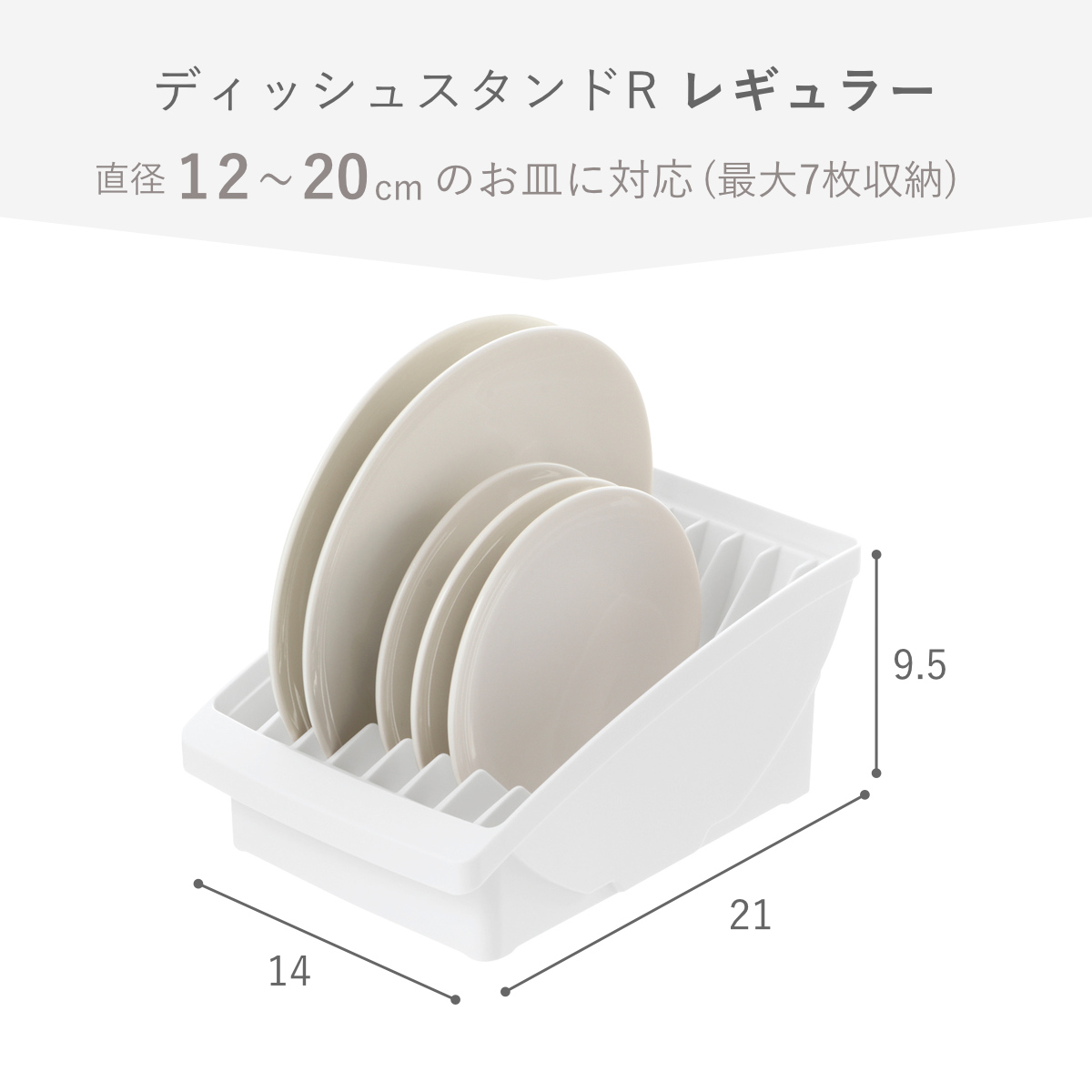 直径12~20cmまでのお皿を収納できる棚置き用ディッシュスタンドのレギュラーサイズです。大きめの醤油皿から取り皿、ちょっとしたメイン料理用の中皿くらいのサイズが最大7枚立てて収納できます。