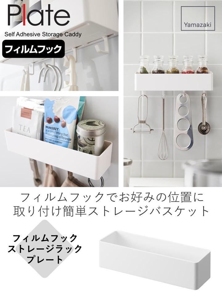 お好みの位置に簡単に取り付けができるストレージラックです。フィルムフックは粘着力が高く、壁に穴をあけずに設置できます。水にも強いのでキッチンのシンク周りや浴室でも気にせずに使用可能です。