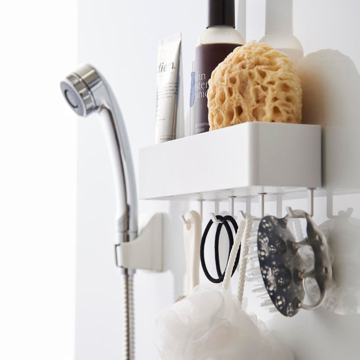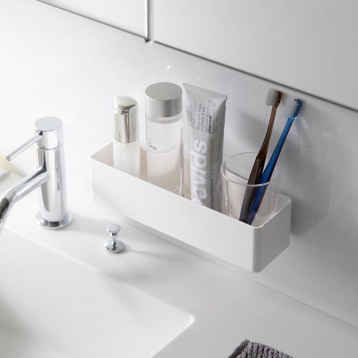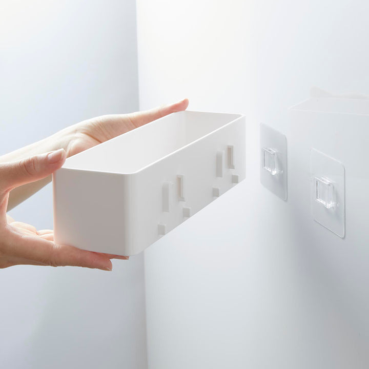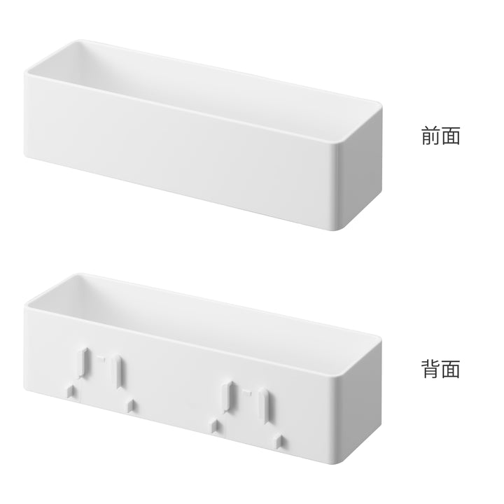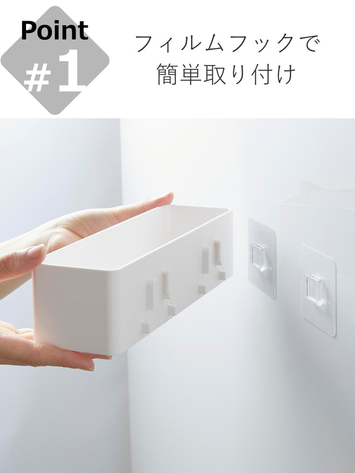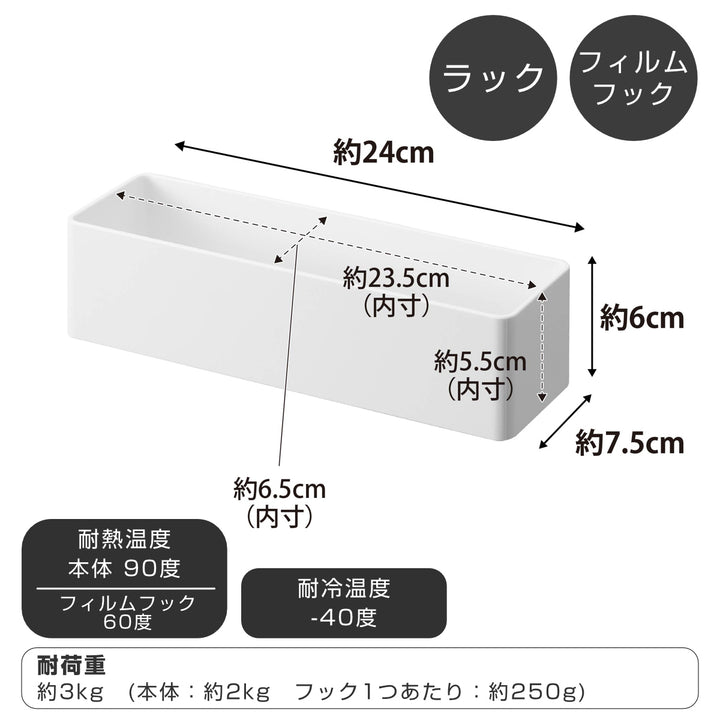 | サイズ | 外寸:約 幅24×奥行7.5×高さ6(cm) 内寸:約 幅23.5×奥行6.5×高さ5.5(cm) フック取り付け時:約高さ8.5cm フィルムフック接着面:約幅6×高さ6cm(1つあたり) |