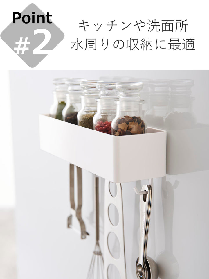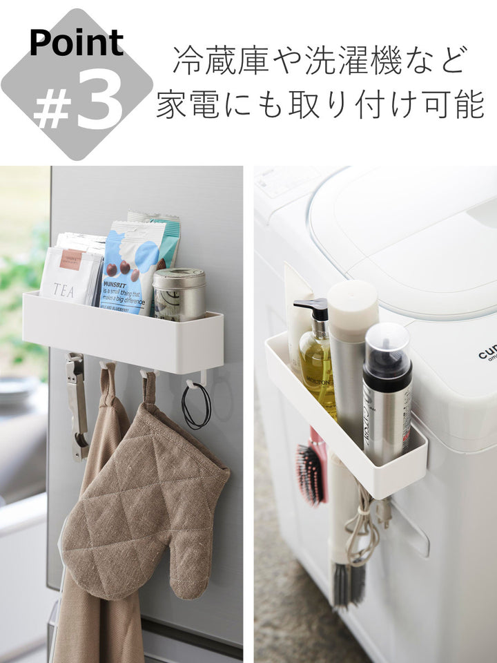 冷蔵庫や洗濯機などの家電にも取り付けることができます。キッチンであれば調理器具やポリ袋などの雑貨、洗面所であればドライヤーや洗剤収納など、こまごました小物類をひとまとめに収納するのにも最適です。