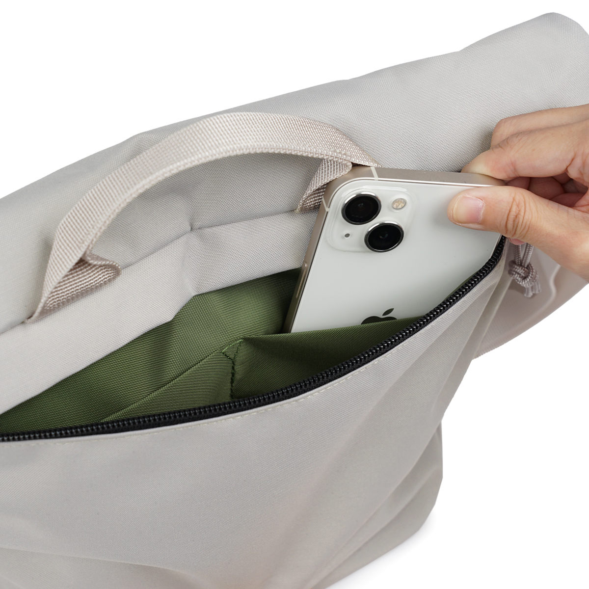 背面にはファスナーポケットが付いており、さらに中にも仕分けできるポケットもあります。スマホなどさっと取り出したい物の収納に便利です。