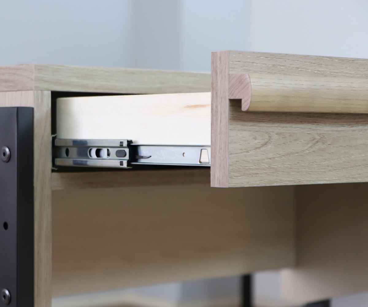 奥に入れた物が出し入れしやすいフルスライドレール仕様の引出しが2杯付きです。デスク周りの小物や書類などの整理に最適です。栗無垢材の豊かな表情が温かみのある大きめの取っ手は、下部にくぼみがあり開け閉めがしやすいデザインです。