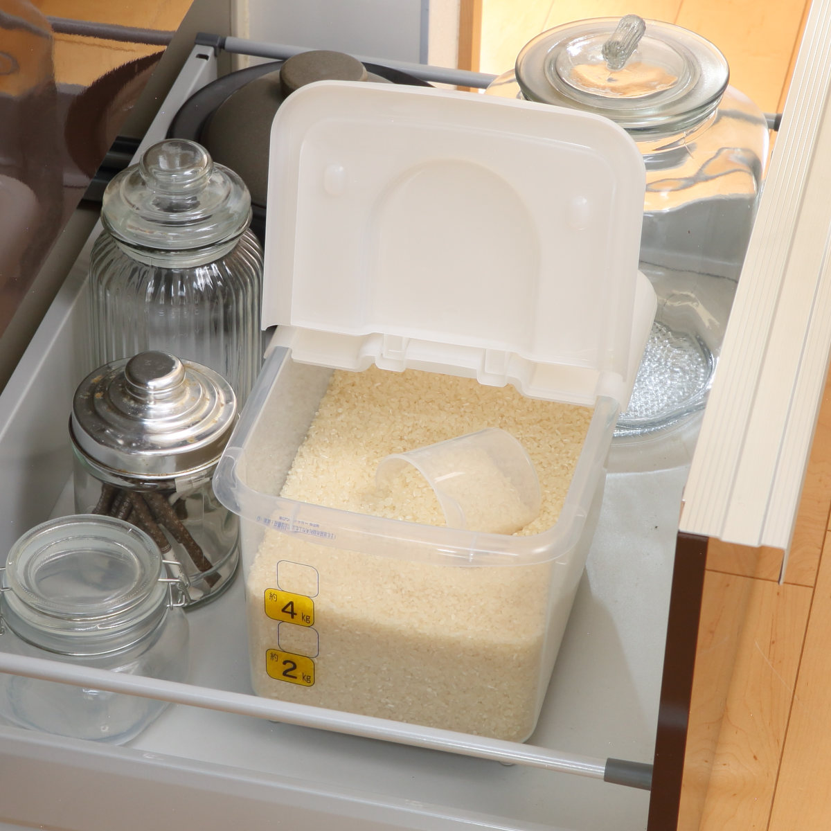 システムキッチンの引き出しやシンク下などに収納できるコンパクトサイズの米びつです。シンプルでスッキリとしたデザインなので、キッチンカウンターなどに出したままでも圧迫感がなく、空間を邪魔しません。