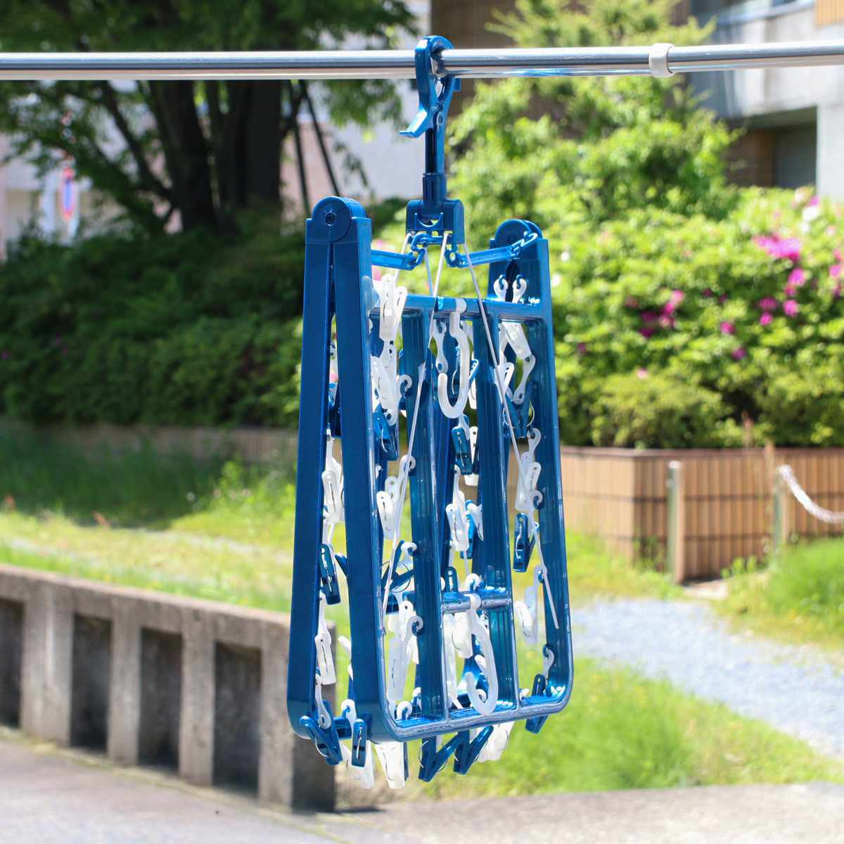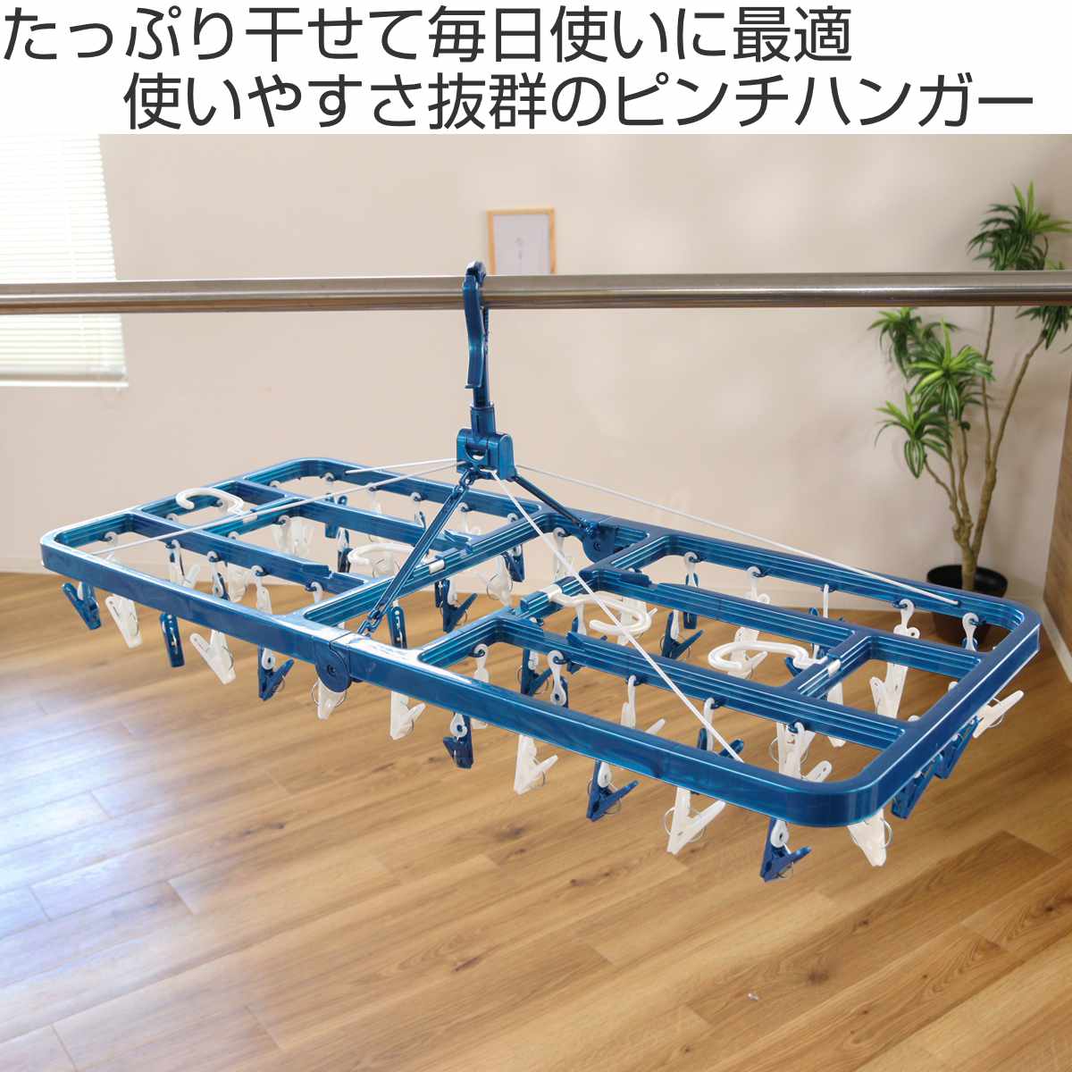 物干し竿や洗濯ロープにしっかり固定できるキャッチ式。風が強い日でも安心して干すことができます。直径25~39mmの竿に対応しているので、ふとん干し用太竿にも使用できます。