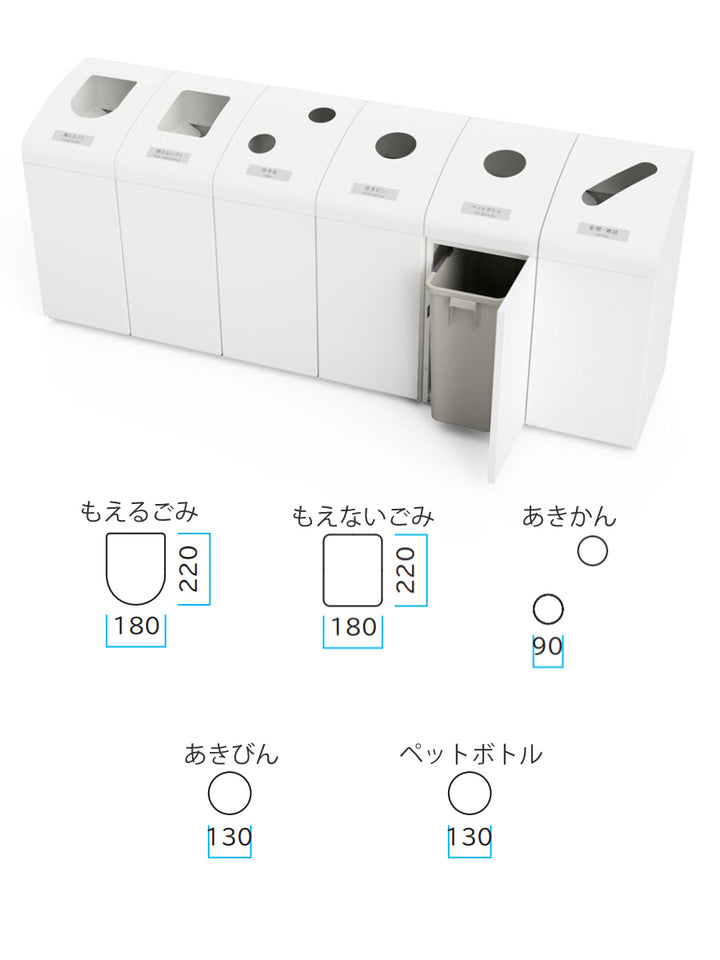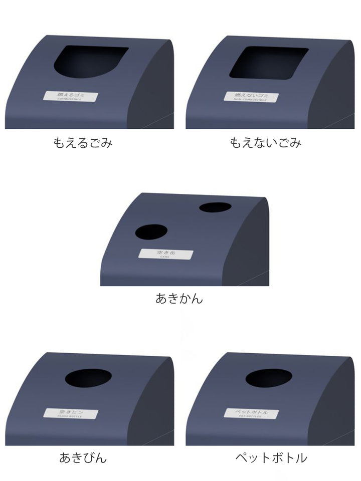 5種類の投入口から、目的・用途に応じて自由に組み合わせてお使いいただける屋内分別用ゴミ箱です。上質でシンプルなデザインなので、景観を崩さず様々な施設にマッチします。学校や病院、ホテルやレジャー施設など様々な環境で配置しやすいデザインです。並べて設置しやすいコンパクトなサイズです。