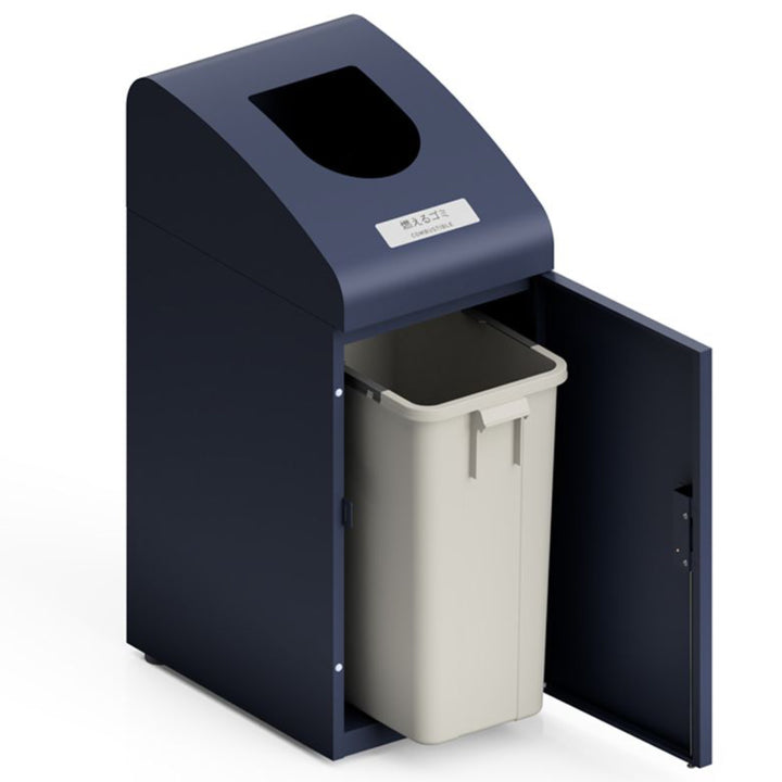 投入口も本体と統一カラーで、ゴミを捨てやすいよう傾斜のある仕様です。分別がしっかりできるよう、空き缶やペットボトルなどゴミのサイズに合わせた形に。捨てたものが見えにくい設計です。