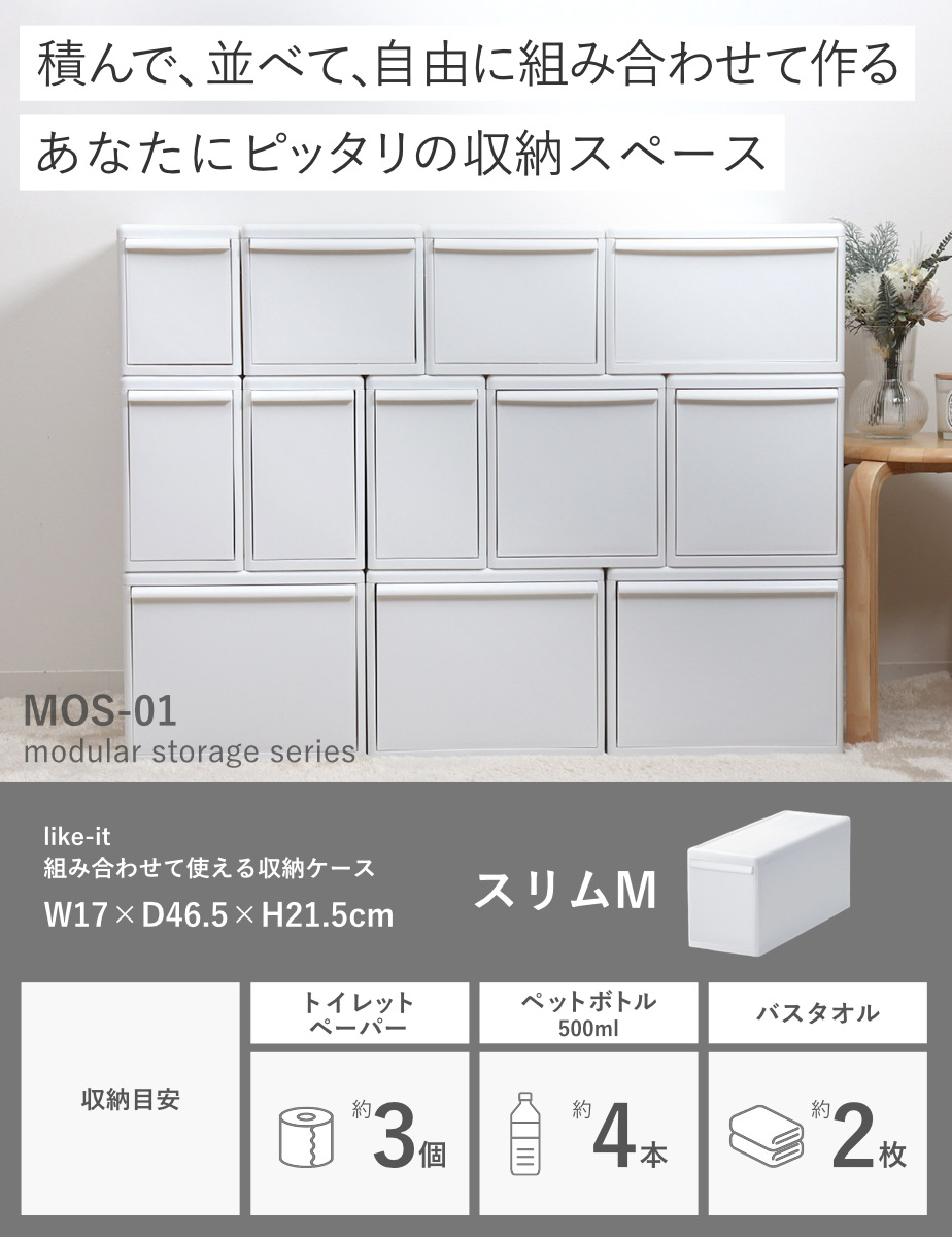 3種類の幅の異なる収納ケースでも積み重ねができるスタッキング構造で、自由にカスタマイズができます。無駄な空間を作らないブロック式構造なので、スッキリとした見た目です。MOSの収納ケースなら、スペースを有効活用したあなただけの「理想の収納」が作れます。