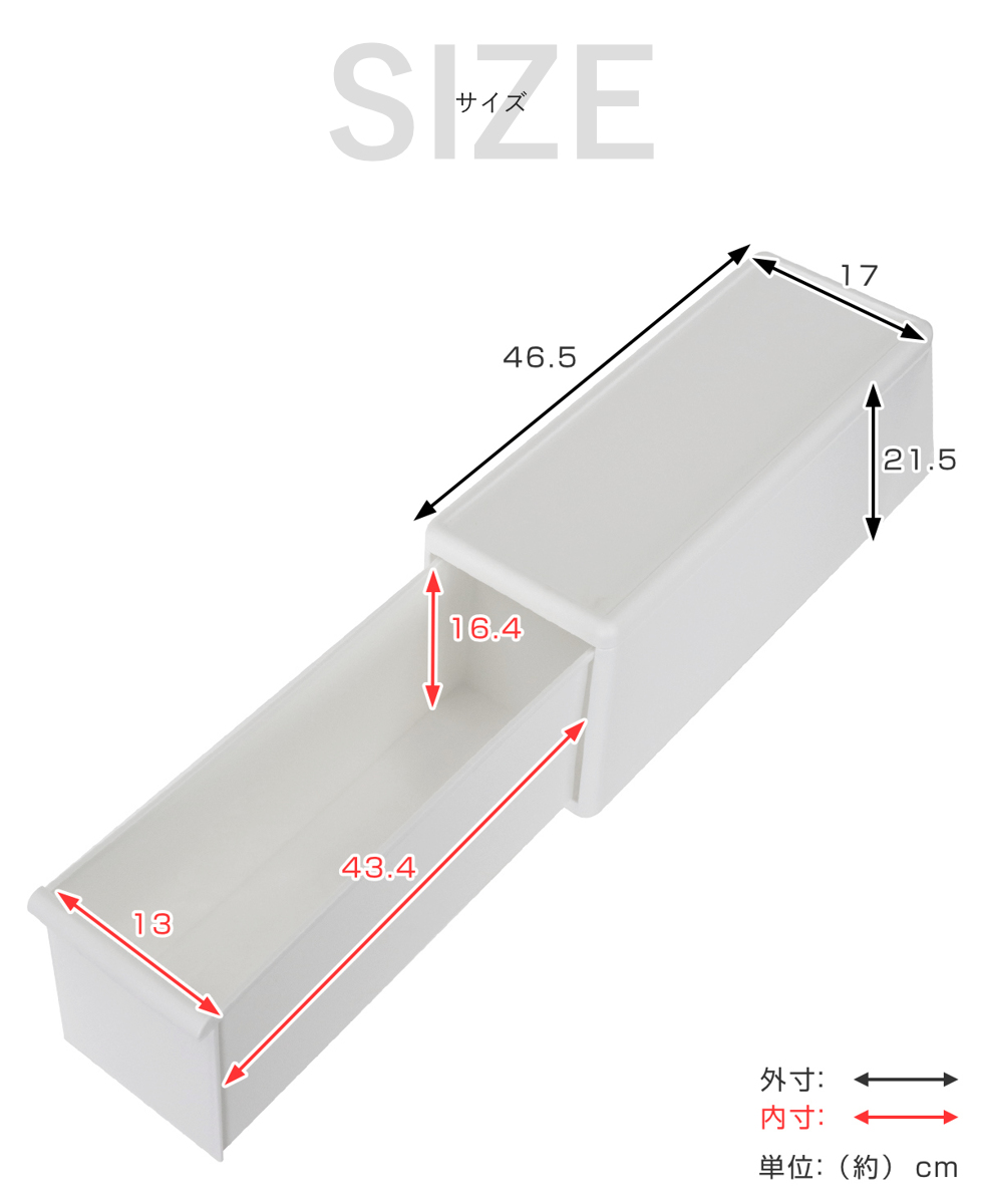 | サイズ | 約 幅17×奥行46.5×高さ21.5(cm) 引出し内寸:約 幅13×奥行43.4×高さ16.4(cm) |