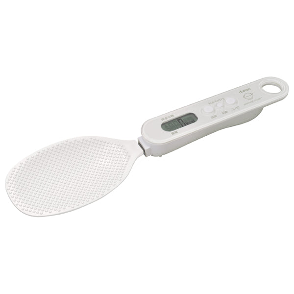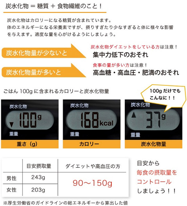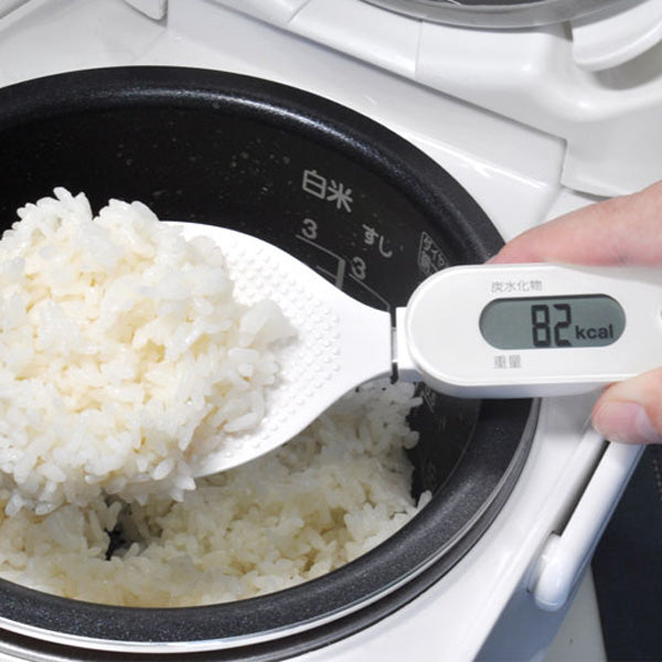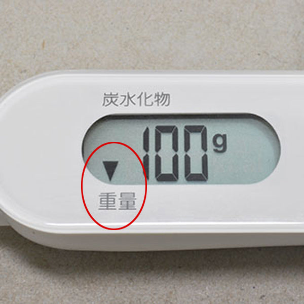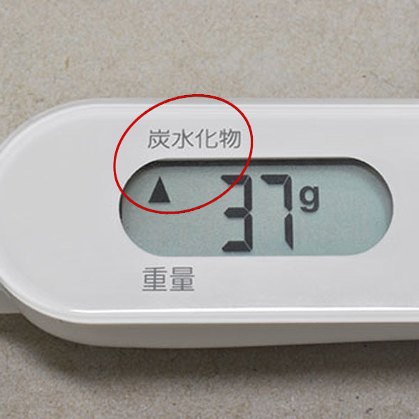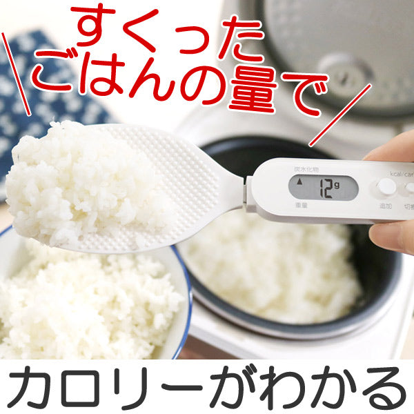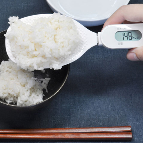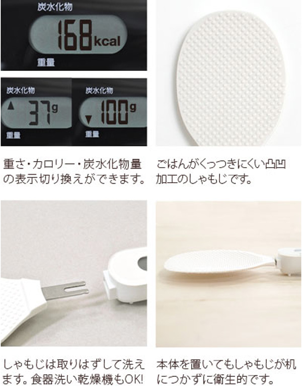すくったご飯の量でカロリー、重量、炭水化物量が一目でわかる! ごはんの重量・カロリー・炭水化物量がはかれるしゃもじ型スケールです。 すくった量のご飯の重さ、カロリー、炭水化物量がディスプレイに表示され一目でわかります。 | ||