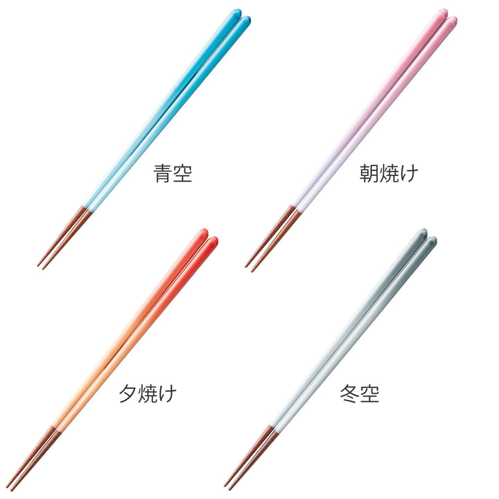 青空、朝焼け、夕焼け、冬空をイメージした美しい色合いのお箸です。シンプルで飽きのこないデザインなので、普段使いはもちろん、プレゼントにも最適です。サイズは男性の手でも使いやすい23cmです。