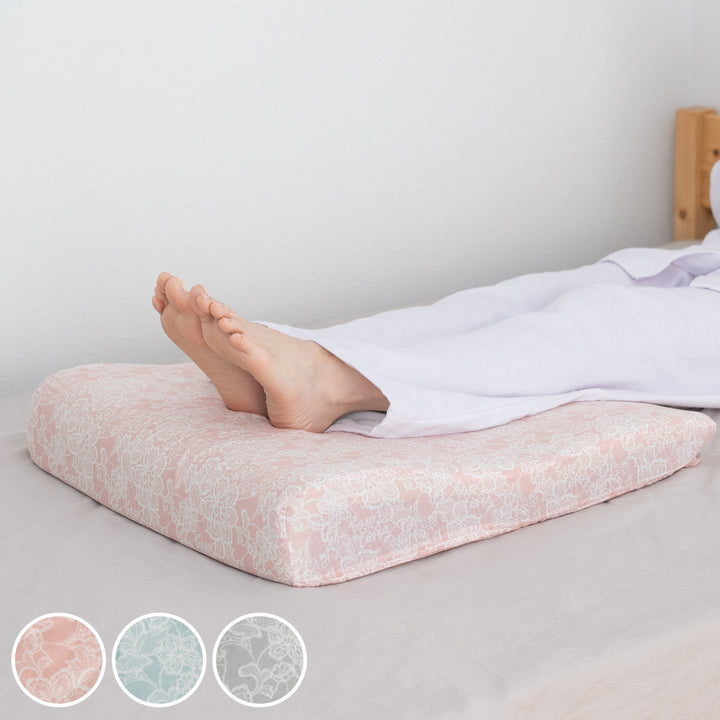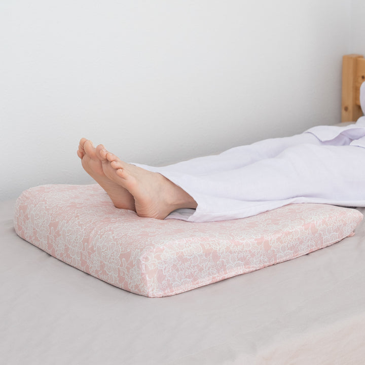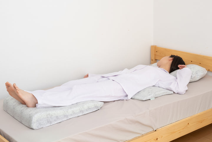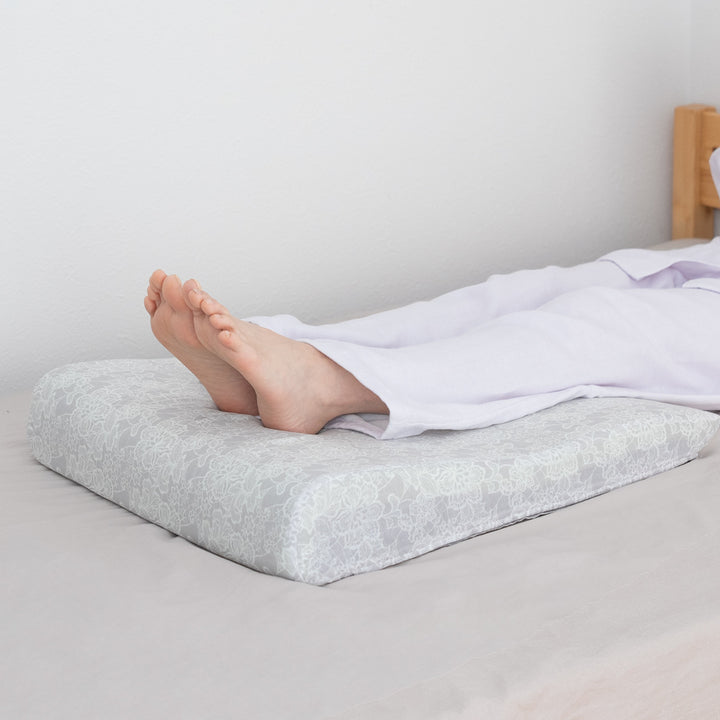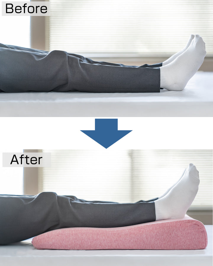 横になった状態でアキレス腱あたりが心臓より少し高くなる高さが理想的です。足首をほどよく持ち上げ、ふくらはぎから太ももまでを優しく支えて足をケアします。フットピローを使用することで、無理なく足上げの姿勢になり、ひざに負担がかかりません。