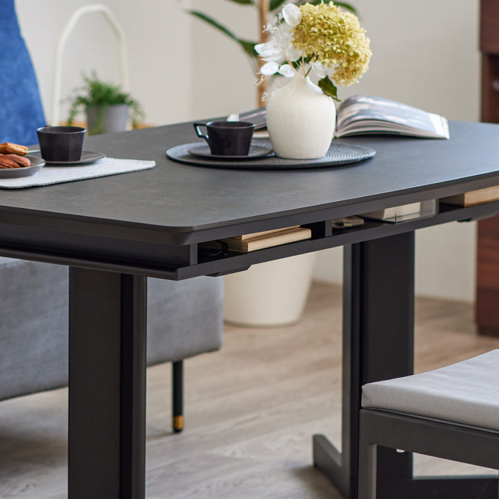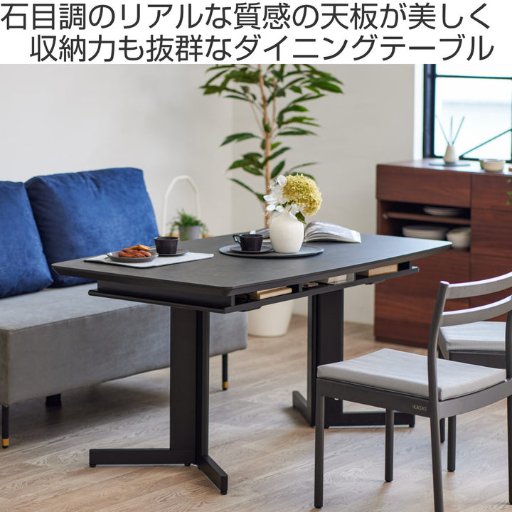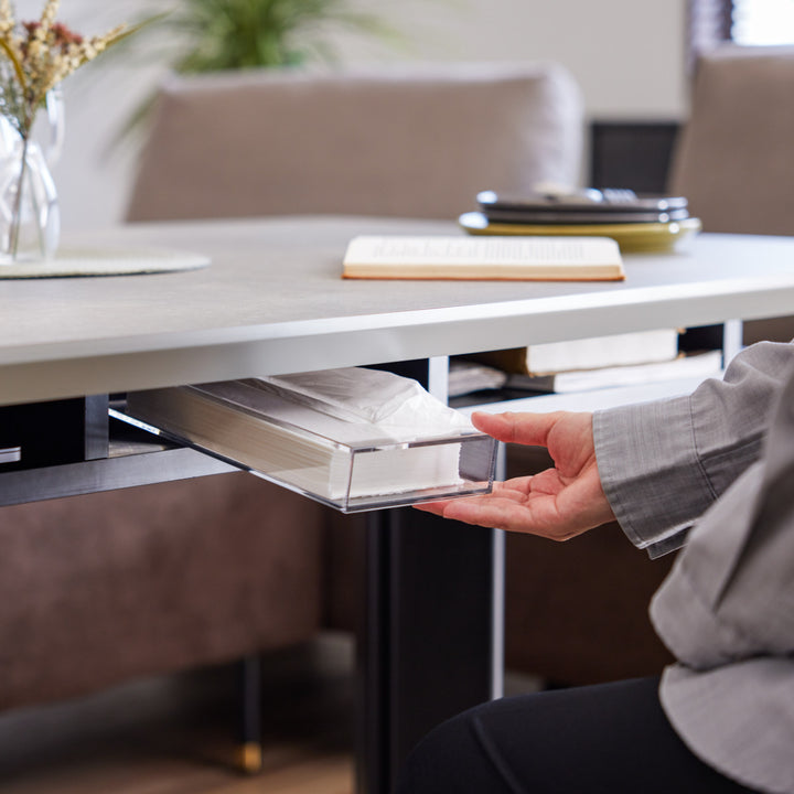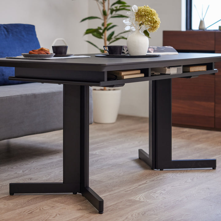 ダイニングテーブルで食事をしたり、パソコンなどを使って作業をすることは多いと思いますが、テーブルの上をその都度片づけるのが面倒だなと感じたことはないでしょうか。こちらのテーブルは収納スペースがあることで、サッとテーブルの上の物を片づけられて、作業から食事の流れがスムーズに行えます。そんな、日常のちょっとした時間の節約につながるダイニングテーブルです。