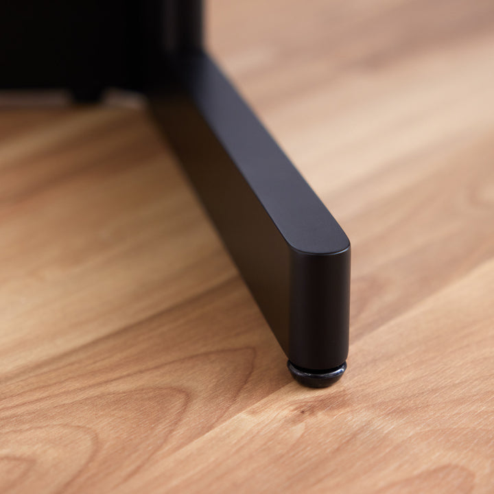 板状の脚をV字型に組み合わせることで安定感とスッキリとしたデザインを実現しました。足先にはアジャスターが付いているため、ガタつきを感じた場合は微調整することができます。
