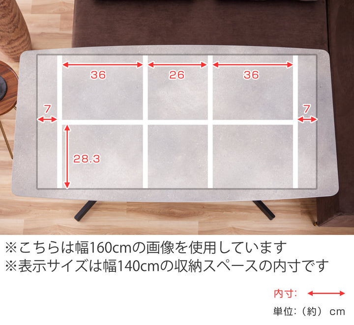 両サイドから出し入れ可能な収納スペースがあります。奥行き28cm、高さ5.5cmでノートパソコンやお子様の勉強道具、化粧品、スマートフォンなど普段テーブルの上で使うものをまとめて整理することができます。