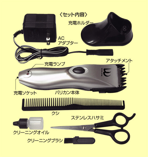 ●セット内容:充電ホルダー、ACアダプター、バリカン本体、アタッチメント、クシ、ステンレスハサミ、クリーニングオイル、クリーニングブラシ