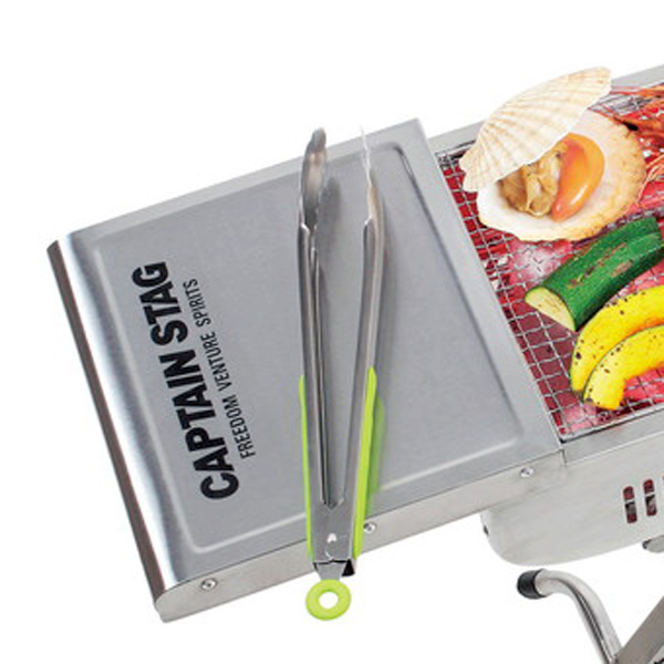 ![]() 両面の蓋がスライド 両面の蓋はスライドして簡易トレーになります。トングやお皿などを置くことができて便利です。バーベキュー網は、串がなくても焼ける格子網です。 |