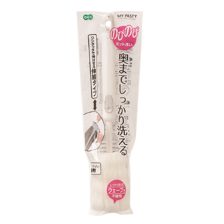 奥までしっかり洗える伸縮タイプの柄付きスポンジ