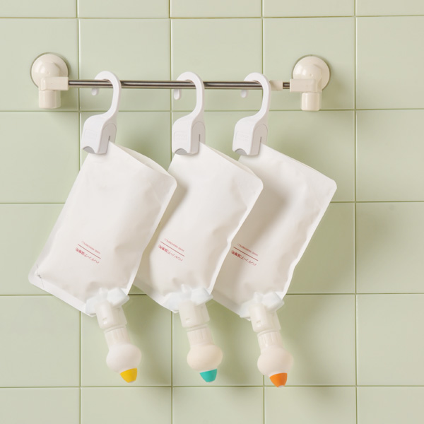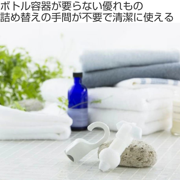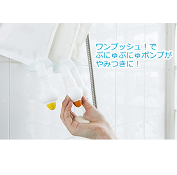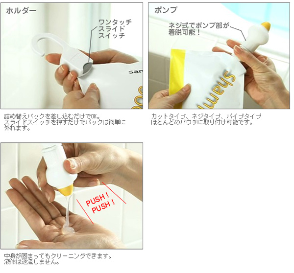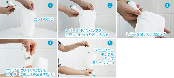 シャンプーなどのパウチにそのまま取り付けられますので、ボトルへの詰め替えの煩わしさがなく、無駄なく使えます。