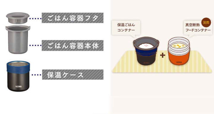 ごはんを温かく持ち運べる ごはんを温かく保温するケースは真空断熱構造で高い保温力です。ご飯は、お茶碗約1.8杯分(約0.8合)入ります。 |