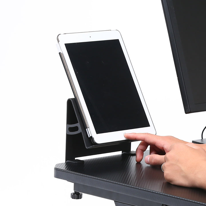 タブレットなどを立てられるスタンド付きです。立てることで操作もしやすく画面も見やすいです。