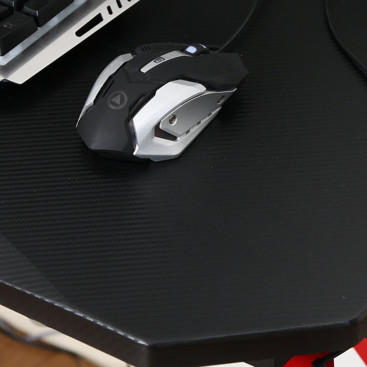 カーボン調デザインシートの天板と無骨なスチール脚、パワードスーツのような装飾やカラーリングが大人の子ども心をくすぐるデスクです。