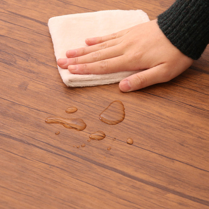 天板には水や汚れに強い素材を使用しています。飲み物がこぼれてもさっと拭くだけで良いので、お手入れに気を使いません。また、木目を側面までしっかり施し、無垢材のような重厚感を持たせています。
