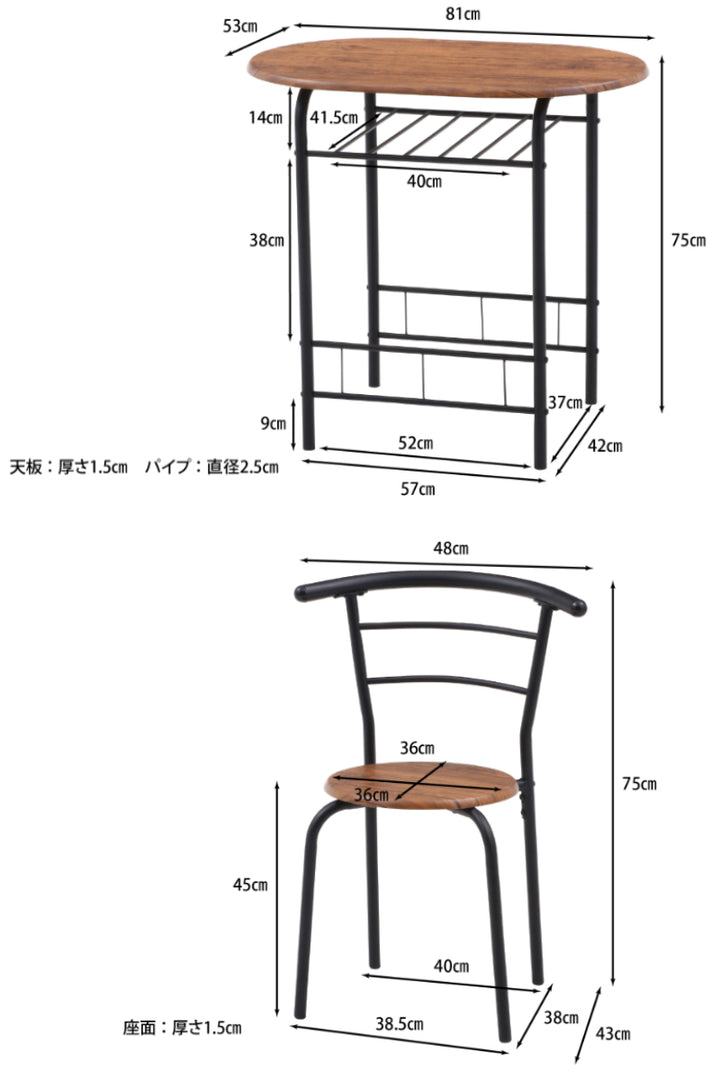 | サイズ | 座面高:約 45(cm) テーブル:約 幅81×奥行53×高さ75(cm) チェア:約 幅48×奥行43×高さ75(cm) |