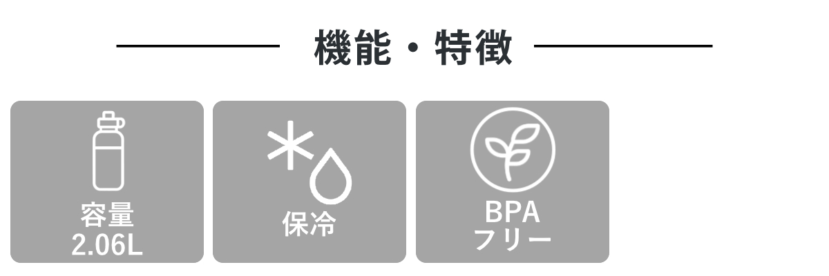 大容量サイズのステンレスクールボトルです。高い保冷力を誇るステンレス真空2重のまほうびんなので、キンキンに冷えた飲みものを長時間しっかりと飲みごろ温度をキープします。容量2.06Lなので、ゴクゴク飲みたいアウトドアやスポーツシーンなどにおすすめです。