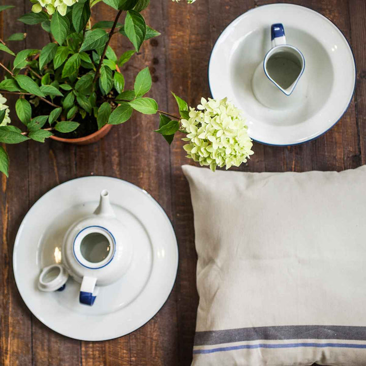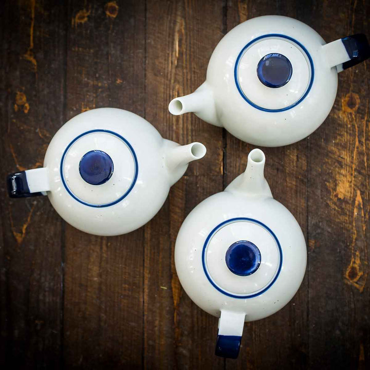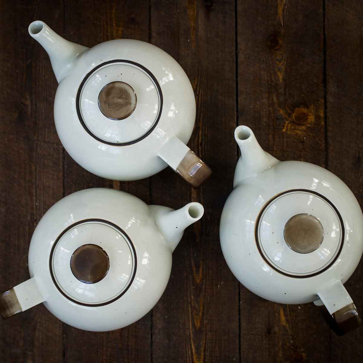 素地のランダムな黒点とハンドペイントで色付けされた縁が特徴的なティーポットです。陶器のような風合いですが、より使い勝手の良い磁器で、陶器のようなデザインを演出したいという思いから作られました。機能的で扱いやすく、爽やかな雰囲気が漂うアイテムです。