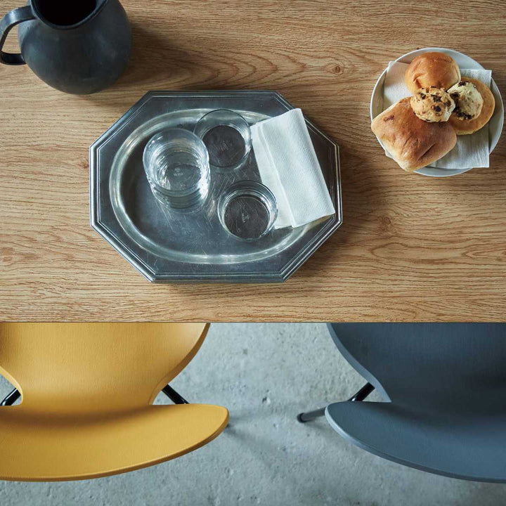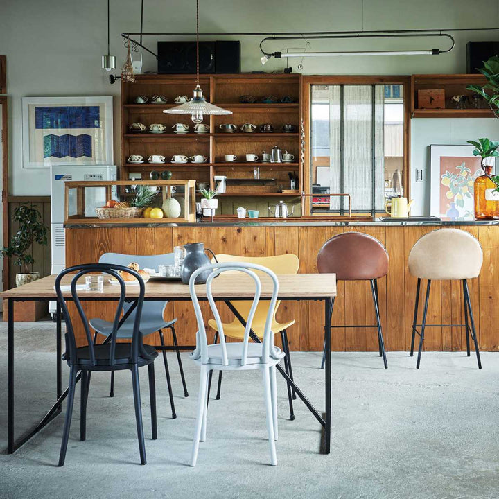 天板を支えるブラックスチールの脚はシンプルで無骨な素材感ですが、細身にすることで全体的にスタイリッシュな印象です。