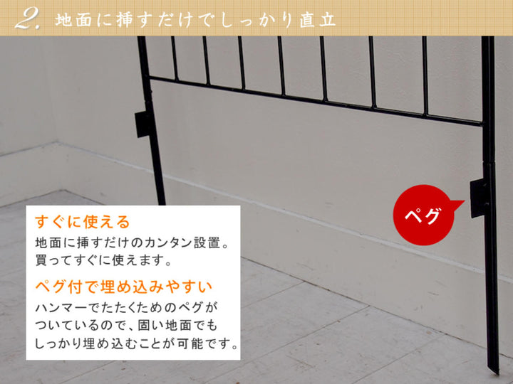 地面に挿すだけの簡単設置で、買ってすぐに使えます。ハンマーでたたくためのペグがついているので、固い地面でもしっかり埋め込むことが可能です。