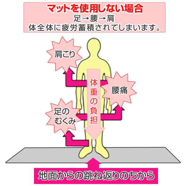 発泡ゴムが疲労を軽減 マットを使用しない場合、体重の負担が地面から跳ね上がり、足から腰や肩と全体に疲労が蓄積されてしまいます。疲労軽減マットを使うと、体重の負担を吸収し、床面からの跳ね返りの力を減らす事によって、疲労の軽減を補助してくれます。 | ||