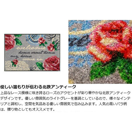 優しい温もりが伝わる北欧アンティーク 上品なレース模様に咲き誇るローズのアクセントが彩り華やかな北欧アンティークデザインです。優しい雰囲気のライトグレーを基調としているので、様々なインテリアと調和し、空間を気品ある優しい雰囲気で包み込みます。人気の高いバラ柄は、贈り物としてもオススメです。 | ||