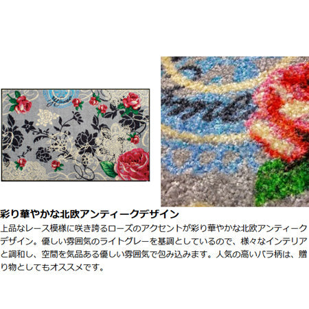彩り華やかな北欧アンティークデザイン 上品なレース模様に咲き誇るローズのアクセントが彩り華やかな北欧アンティークデザイン。優しい雰囲気のライトグレーを基調としているので、様々なインテリアと調和し、空間を気品ある優しい雰囲気で包み込みます。人気の高いバラ柄は、贈り物としてもオススメです。 | ||