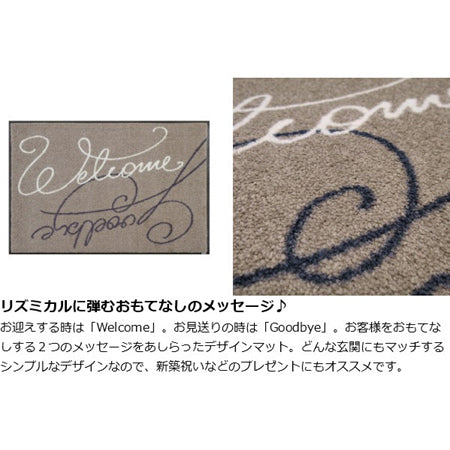 リズミカルに弾むおもてなしのメッセージ♪ お迎えする時は「Welcome」。お見送りの時は「Goodbye」。お客様をおもてなしする2つのメッセージをあしらったデザインマット。どんな玄関にもマッチするシンプルなデザインなので、新築祝いなどのプレゼントにもオススメです。 | ||