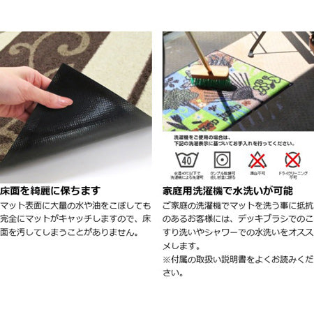 裏面ラバー仕様のインテリアマットで強力な滑り止め効果 日本では裏面ラバー仕様のインテリアマットは非常に珍しいですが、 土足の文化である欧米では非常に一般的。どんな床にも強力にフィットするので、マットがめくれたり、ずれたりすることがなく、小さなお子様やご高齢の方がいるご家庭でも安心です。屋外、玄関先、ベランダ出入り口等でも使用いただけます。 ※裏面ラバーは特殊合成ゴムで、耐久性の高いゴムです。 | ||
