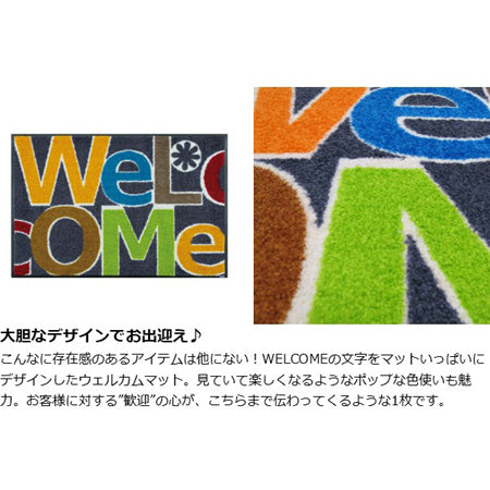 大胆なデザインでお出迎え♪ こんなに存在感のあるアイテムは他にない!WELCOMEの文字をマットいっぱいにデザインしたウェルカムマット。見ていて楽しくなるようなポップな色使いも魅力。お客様に対する”歓迎”の心が、こちらまで伝わってくるような1枚です。 | ||