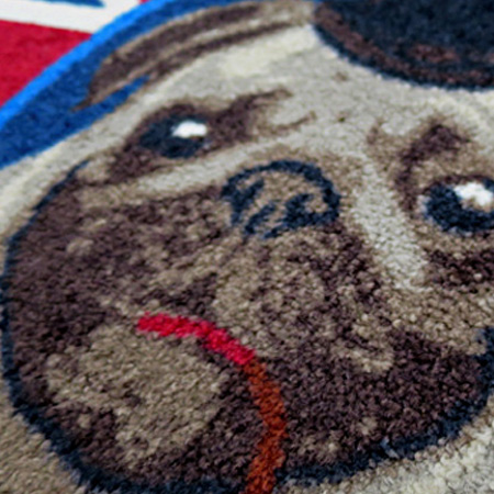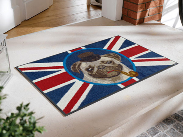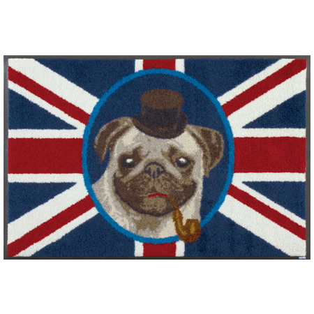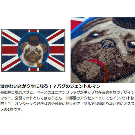 渋かわいさがクセになる!?パグのジェントルマン 英国紳士風のパグと、ベースのユニオンフラッグがポップな存在感を放つデザインマット。玄関マットとしてはもちろん、お部屋のアクセントとしてもインパクト抜群!ユニオンジャック好きな方や可愛いだけのアニマルでは物足りない方にオススメの1枚です。 | ||