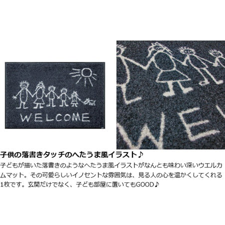 子供の落書きタッチのへたうま風イラスト♪ 子どもが描いた落書きのようなへたうま風イラストがなんとも味わい深いウエルカムマット。その可愛らしいイノセントな雰囲気は、見る人の心を温かくしてくれる1枚です。玄関だけでなく、子ども部屋に置いてもGOOD♪ | ||